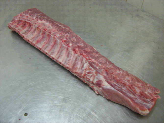 Крупнокусковой полуфабрикат, выделяется из среднего отруба спинной части свиной полутуши с рёберными костями без позвоночника.