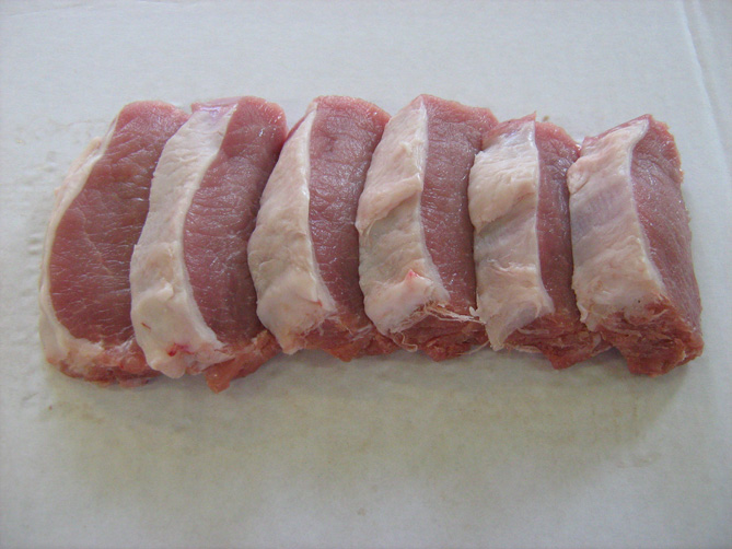Эскалоп свиной (порционный полуфабрикат) нарезается из карбонада свиного, в поперечном направлении по отношению к волокнам в виде кусков мясной мякоти неправильно круглой или овально-продолговатой формы толщиной 10-20 мм.