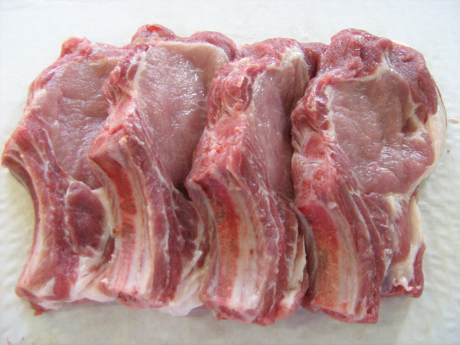Котлета натуральная (порционный полуфабрикат) куски мясной мякоти неправильной округлой или овально продолговатой формы с наличием грудных и поясничных позвонков, толщина порции 25-30 мм, нарезается из свиной корейки.